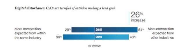 Uber стал нарицательным явлением — «уберизацией» стали называть страх появления трудно прогнозируемого конкурента, способного разрушит отрасль. Процент топов, которые ожидают столкнуться с конкуренцией за рамками своей отрасли, согласно исследованию IBM, за два года увеличился более чем на четверть, с 43% до 54%.