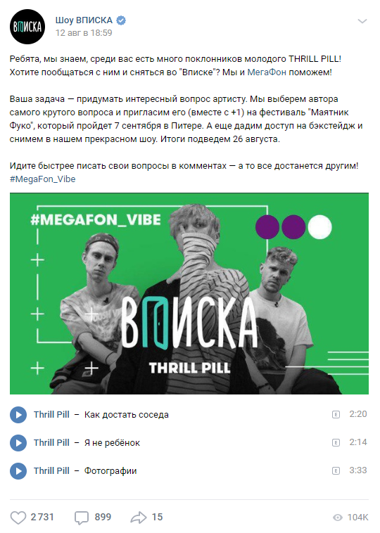 "Вписка" — это серия интервью с современными музыкантами, в основном рэперами. На YouTube-канал проекта подписаны более 600 тыс. человек. Музыка, молодая аудитория и диджитал-среда — идеальное сочетание для реализации задач «МегаФон».