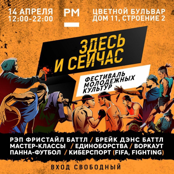 14 апреля 2019 года в Москве при поддержке ФАДМ (Росмолодежь) состоится очередной фестиваль проекта «Здесь и Сейчас», уже успевшего полюбиться многим поклонникам спорта и уличных культур. В этот раз основной «фишкой» программы станет объединение на одной площадке реального спорта с киберспортивными турнирами: виртуозы панна-футбола сразятся друг с другом, пока в соседней зоне ведется борьба за мяч в киберматчах FIFA19, спарринги MMA в октагоне пройдут рядом с игровыми поединками по Tekken 7. Также для всех желающих будет организована игровая зона с приставками и настольный футбол. Вас ждут новые яркие имена на сцене, захватывающие поединки, авторитетное жюри, отличная музыка и чудесное настроение.
