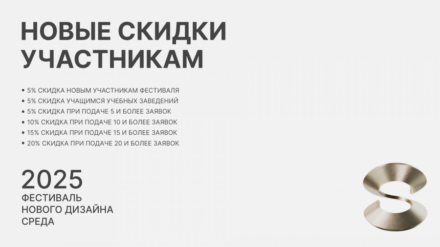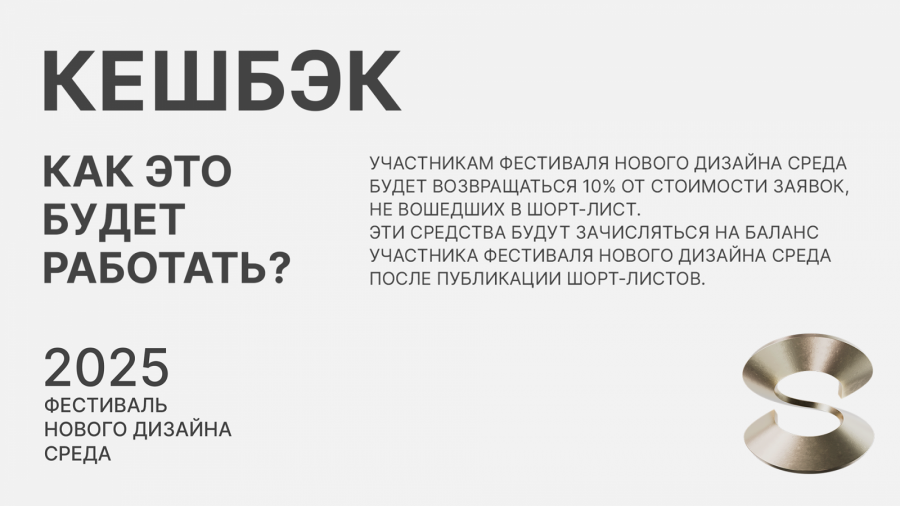 Теперь участникам фестиваля нового дизайна «СРЕДА» будет возвращаться 10% от стоимости заявок, не прошедших в шорт-лист. Потратить кешбэк можно будет в следующем сезоне, оплатив им часть заявок.