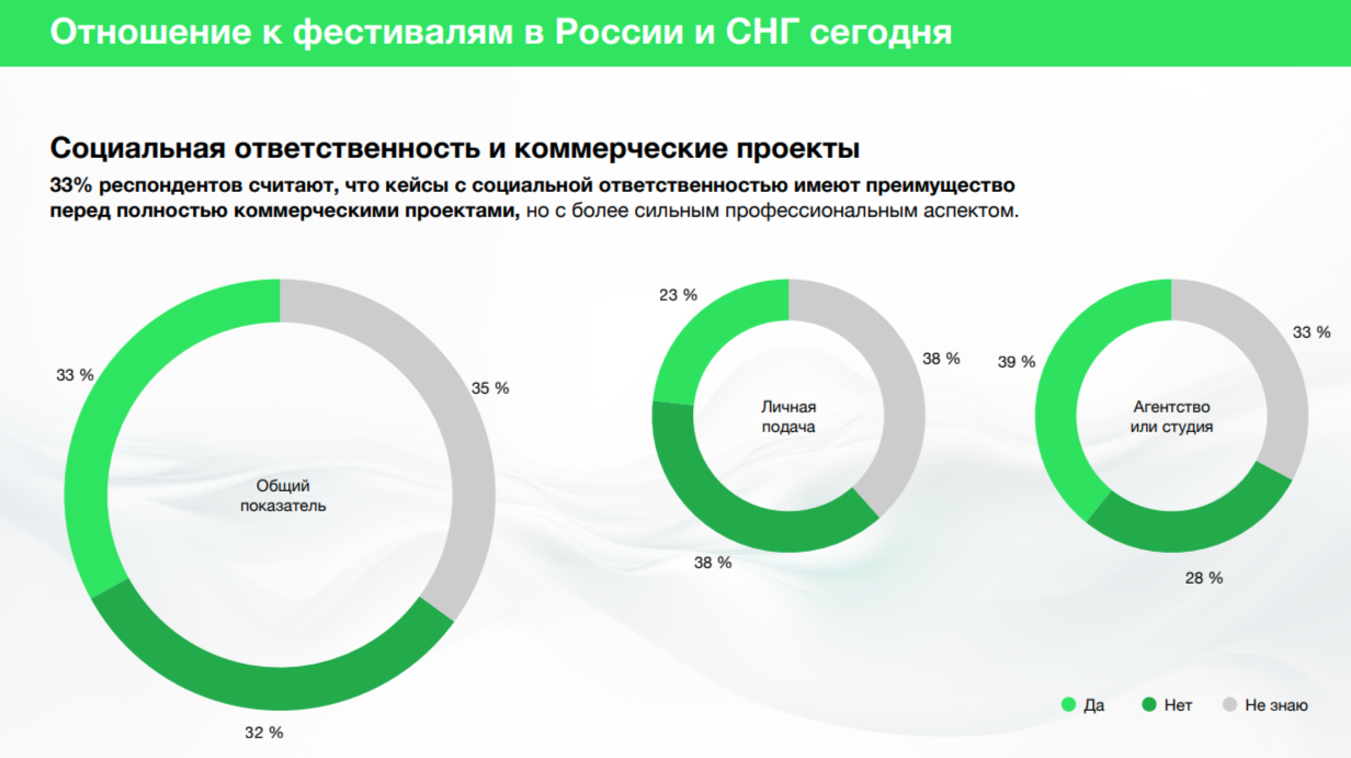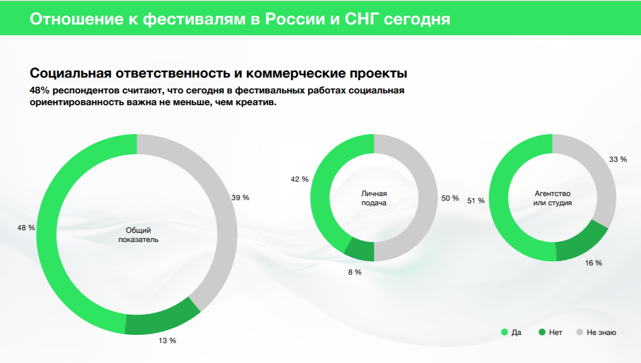 42% лично подающих работы согласны с этим, несогласны с ними 8%, не смогли ответить на этот вопрос 50%. Среди агентств большинство осознает важность устойчивого развития, включающего социальную ответственность — таковых 51%.