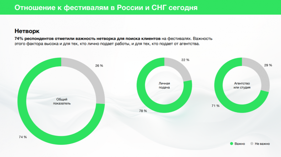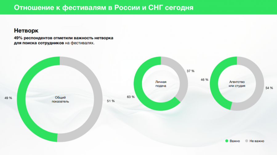 Респонденты отметили, что фестивали полезны нетворкингом. Согласно опросу, 67% участников рынка назвали важным нетворк на мероприятии важным для поиска партнёров на фестивалях. При этом для фрилансеров этот критерий важнее (81%), чем для агентств (58%).