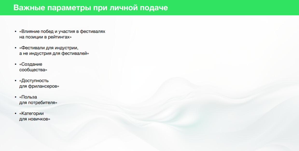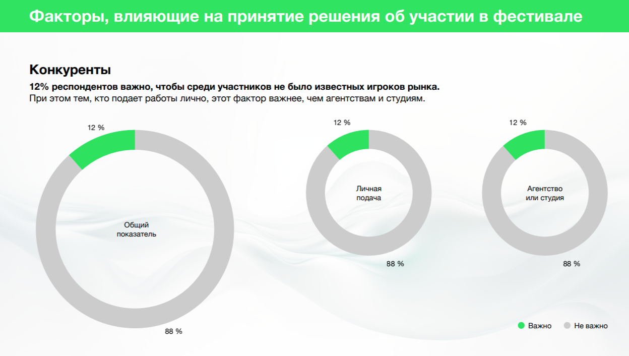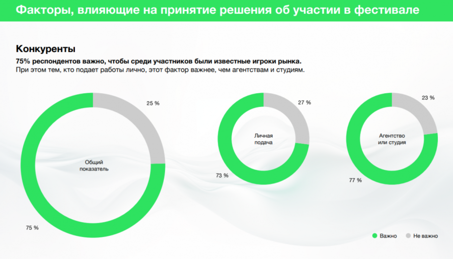 75% респондентов важно, чтобы среди участников были известные игроки рынка. При этом тем, кто подает работы лично, этот фактор важнее, чем агентствам и студиям.