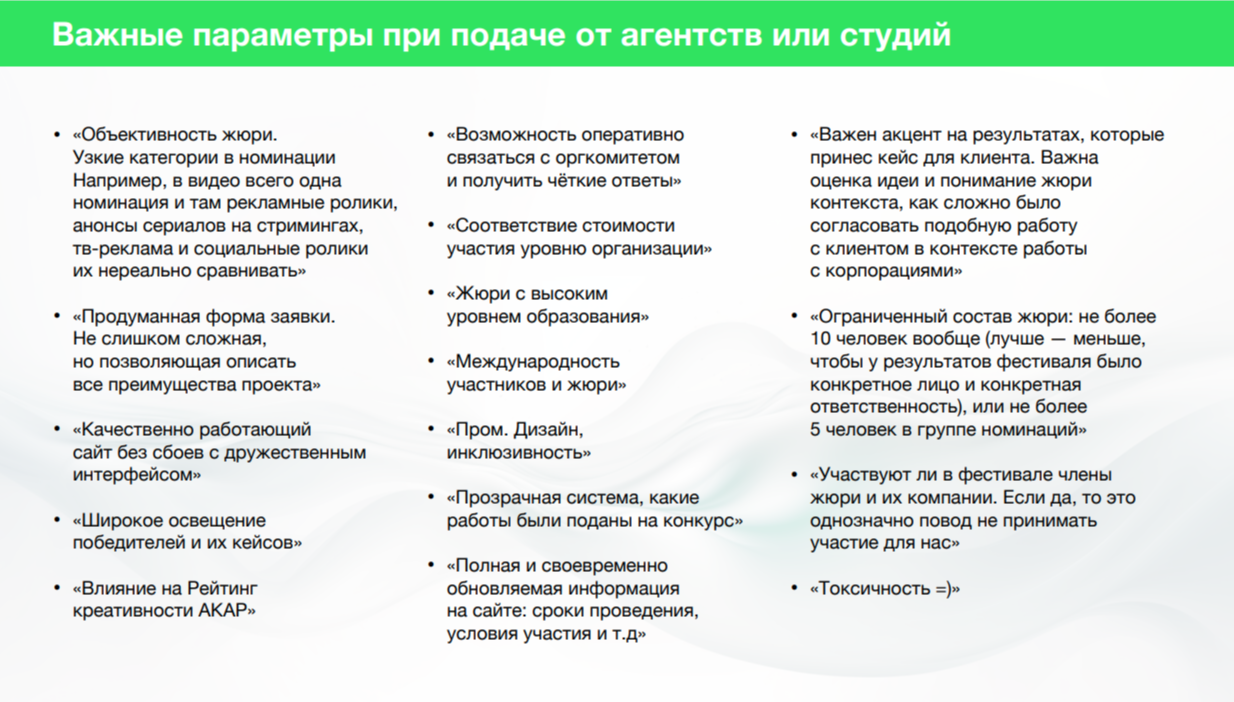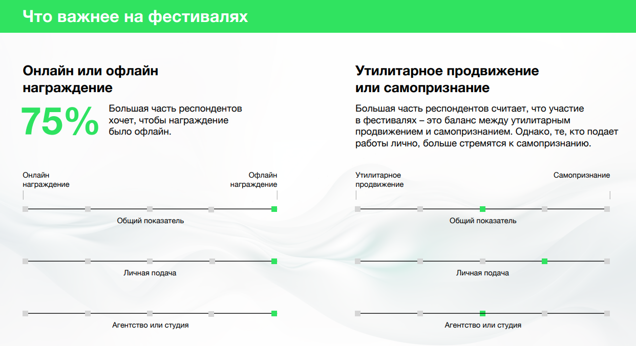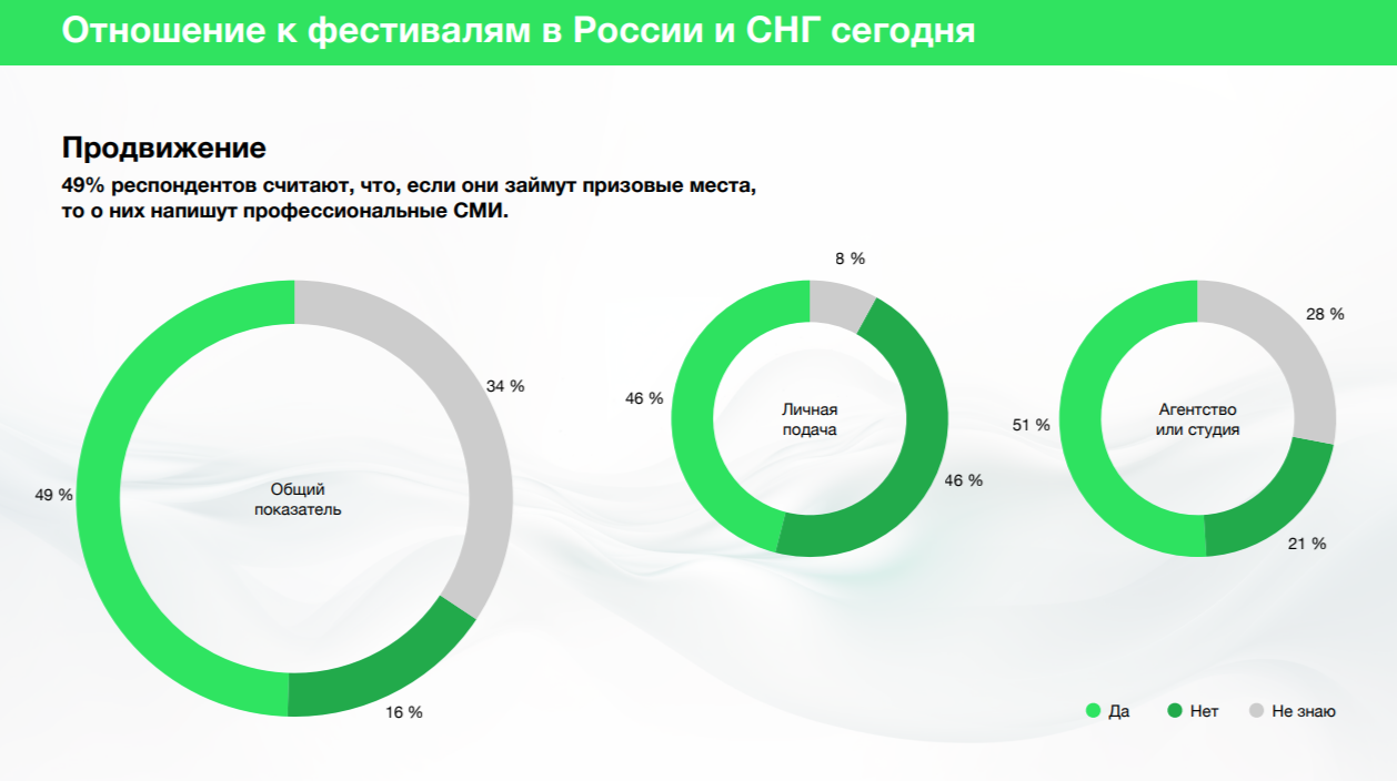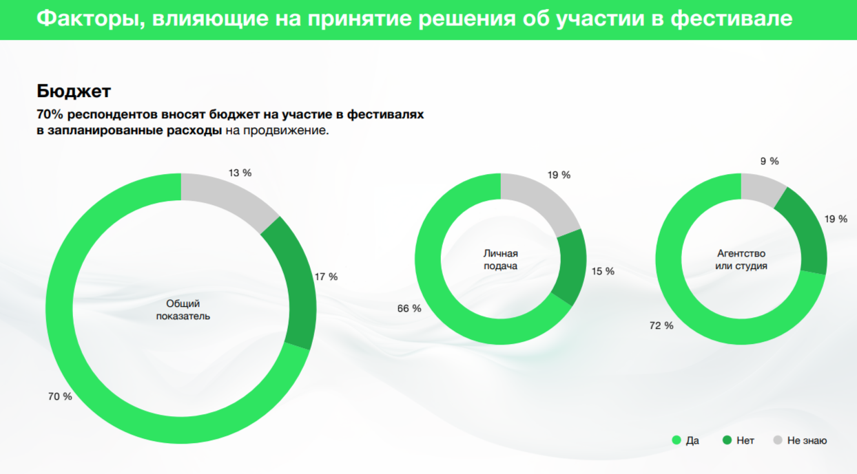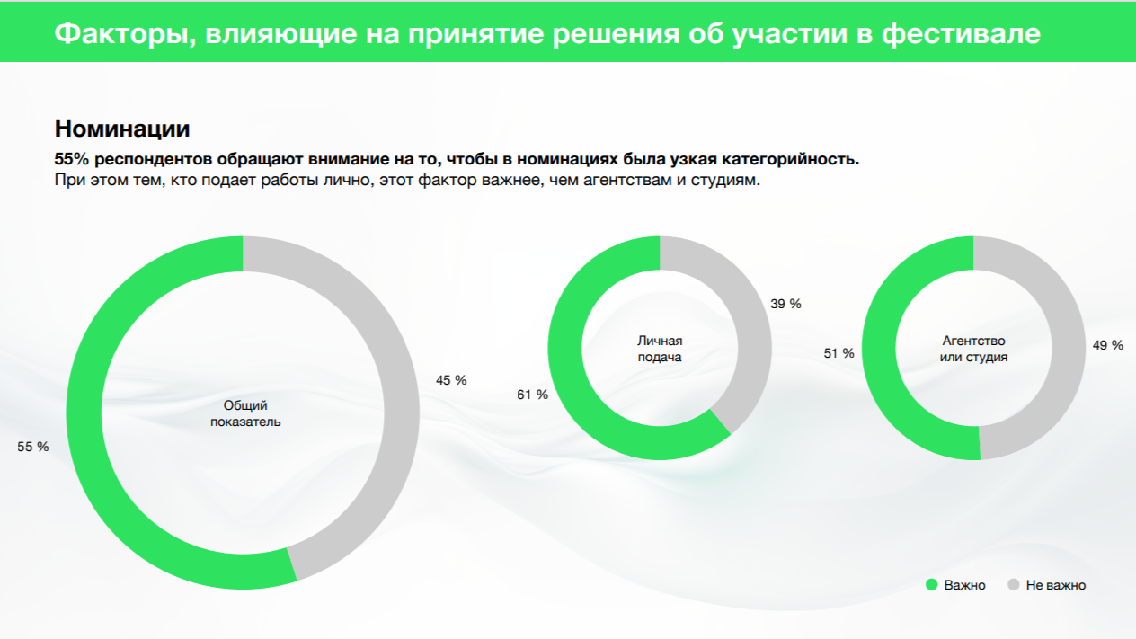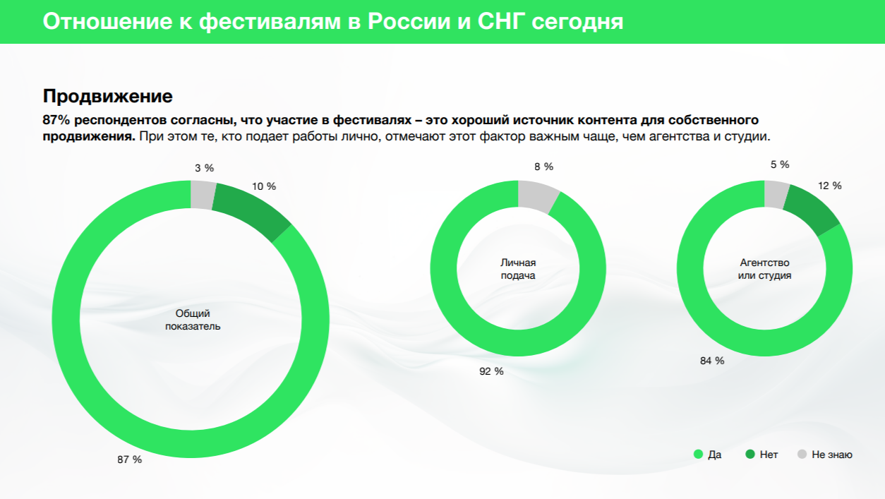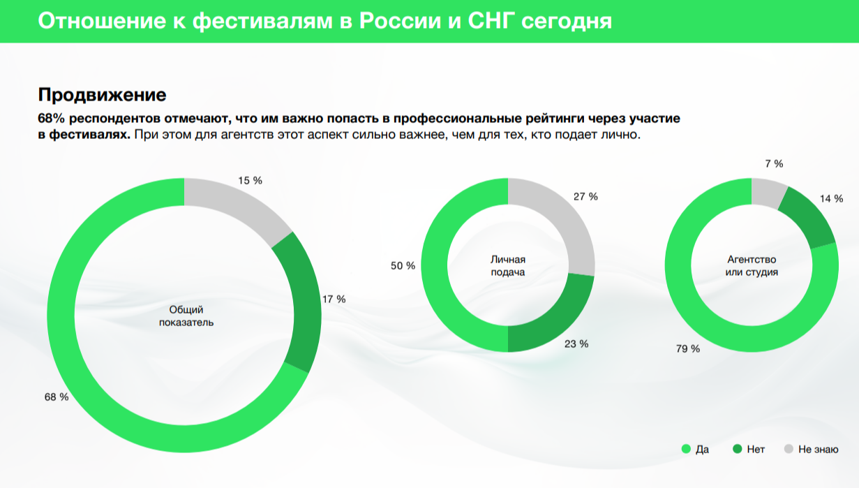 Для 87% респондентов участие в фестивалях — это хороший источник контента для собственного продвижения. При этом те, кто подаёт работы лично, называют этот критерий важным чаще (92%), чем агентства и студии (84%).