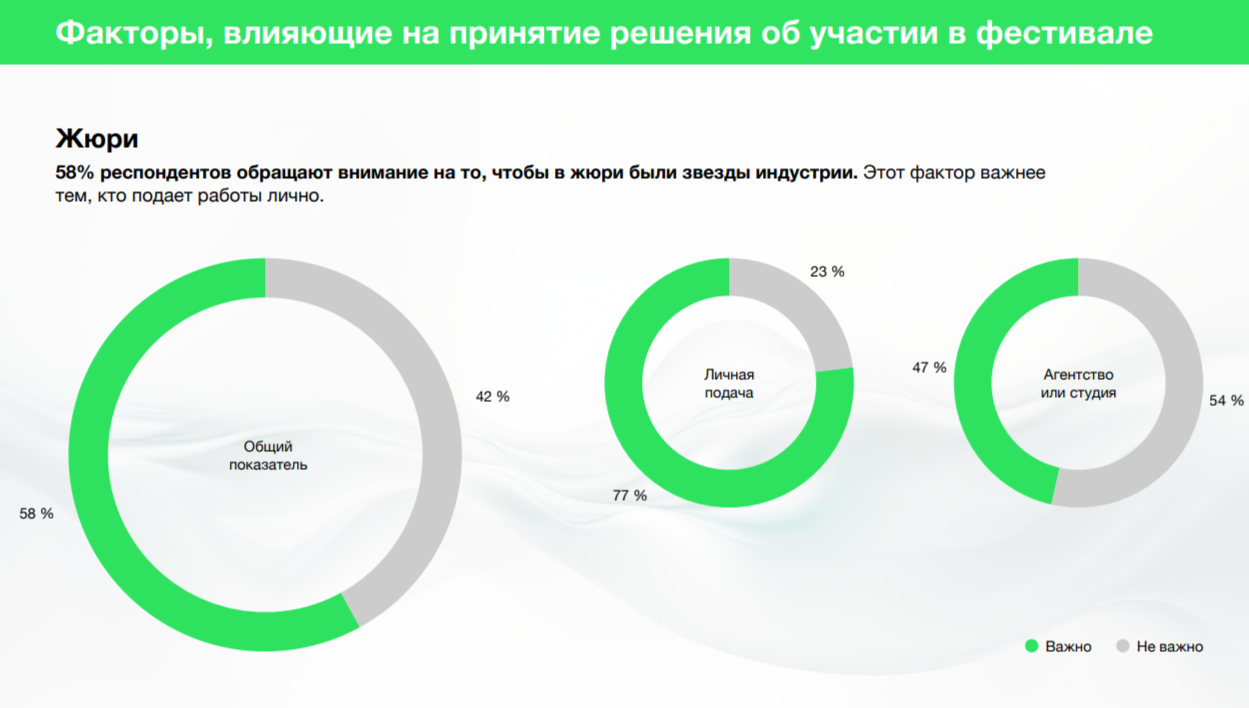 Больше половины опрошенных считают важным присутствие звёзд индустрии в жюри — 58% отмечают важность этого критерия. Этот фактор важнее для подающих заявки лично.