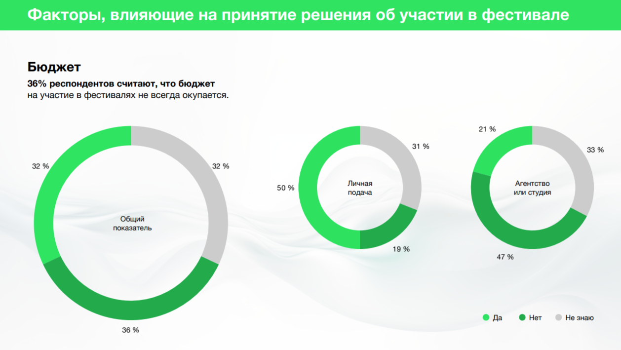 Интересно, что большинство планирует бюджеты на фестиваль, но при этом либо не обращают внимание на окупаемость этих вложений, либо считают, что просто сожгут деньги. Это тоже можно использовать организаторам для собственного продвижения фестов, показывая прямую и косвенную пользу от участия. Пусть клиент не придет в агентство из-за гран-при или золота, но совершенно точно новости о победах расширяют инфополе участника.