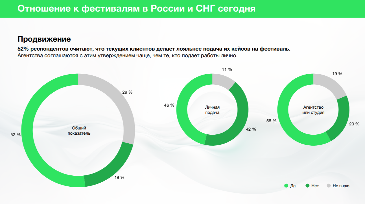 Если кейс клиента будет подан на фестиваль, то это сделает клиента лояльнее, уверены 52% представителей рынка. Агентства соглашаются с этим утверждением чаще, чем те, кто подает работы лично.
