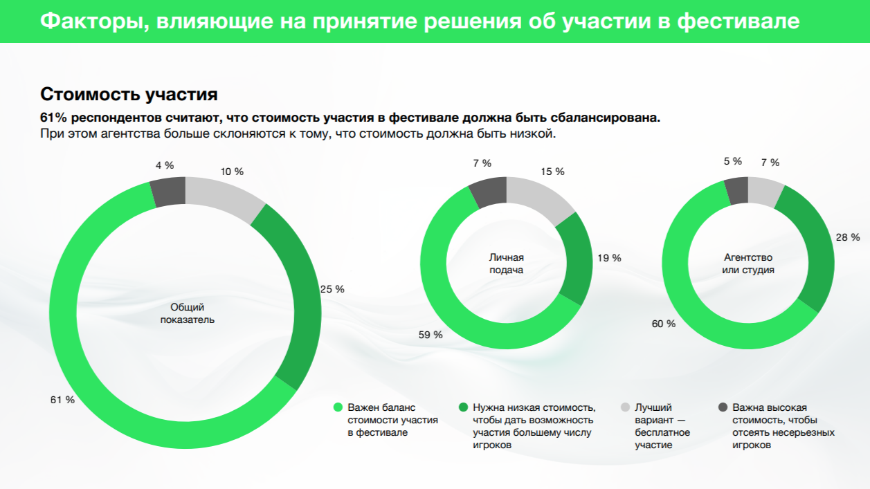 61% респондентов считает, что стоимость участия в фестивале должна быть сбалансирована. 25% считают, что низкая стоимость необходима, поскольку даст возможность участвовать большему числу игроков. 10% выбирают бесплатное участие, 4% считают, что важна высокая стоимость для отсеивания несерьезных участников.