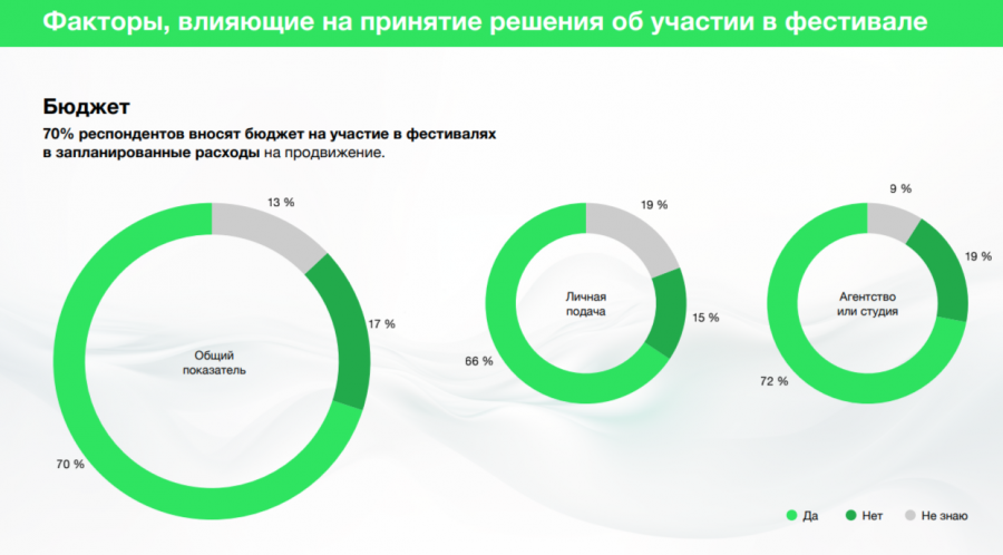70% респондентов вносят бюджет на участие в фестивалях в запланированные расходы на продвижение. Из общего числа опрошенных дизайнеров 66% отметили этот момент, из числа агентств — 72%.