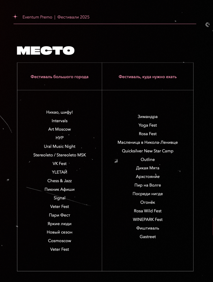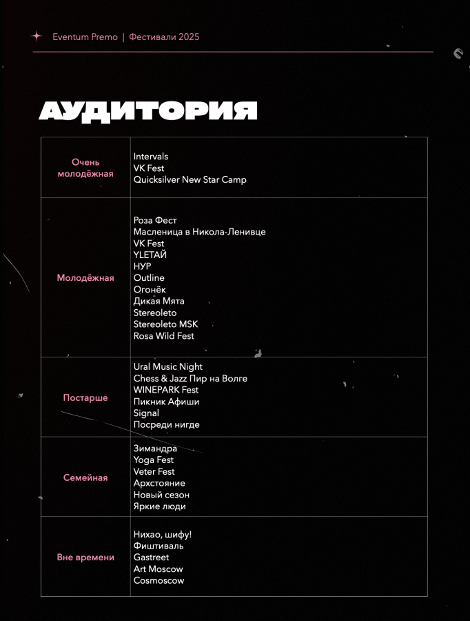 В документе не только перечислены фестивали, но и удобно отсортированы по группам: главная тема, аудитория и место.