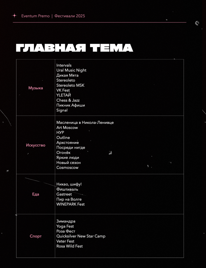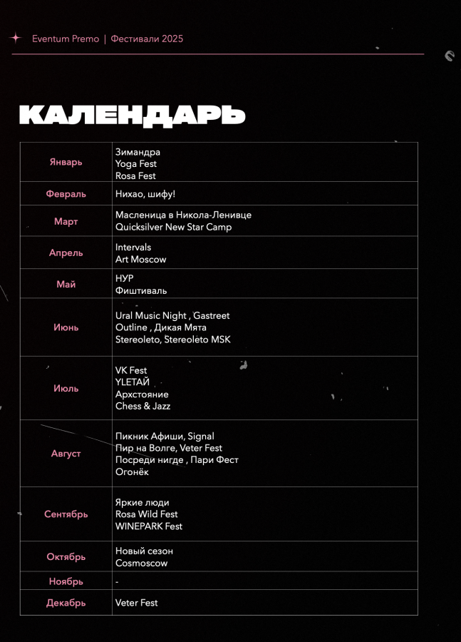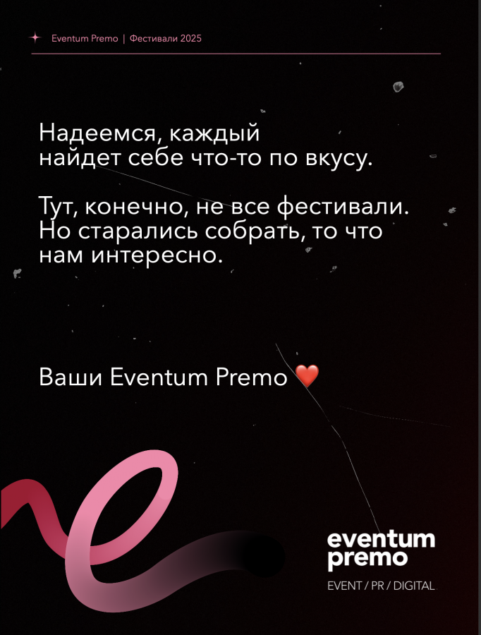 Event-агентство Eventum Premo подготовило подборку самых ожидаемых мероприятий 2025 года. Теперь остается только запланировать даты и места, чтобы провести время с максимальной пользой и удовольствием. Эти события направлены на то, чтобы вдохновлять, удивлять и создавать яркие воспоминания.