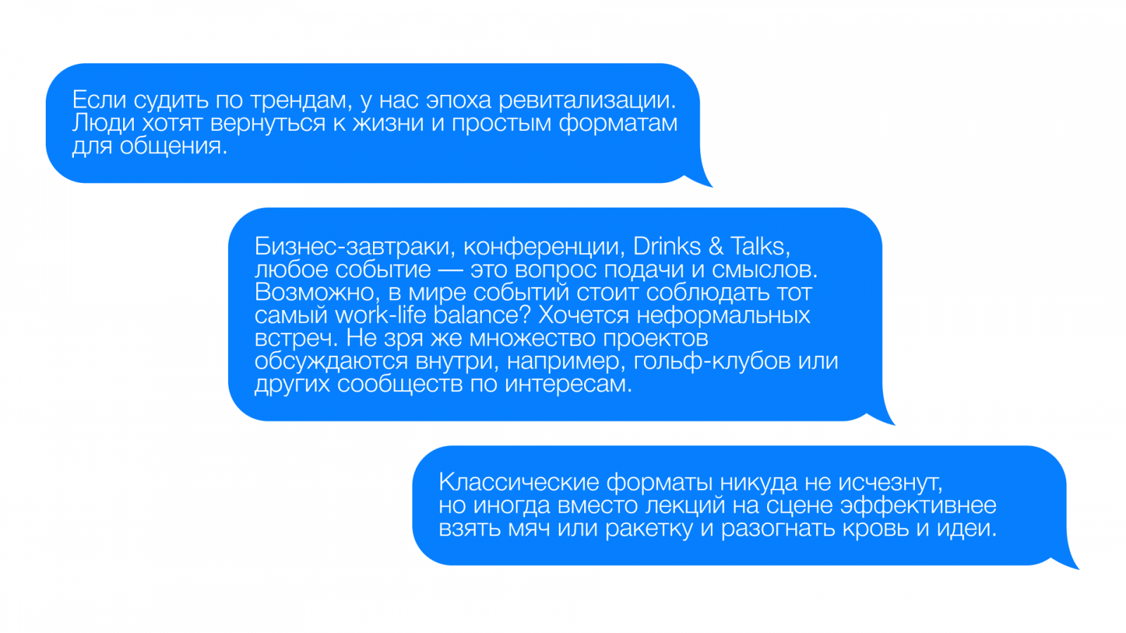 Привычные форматы ивентов по-прежнему будут оставаться эффективными. Они не изжили себя — и, вероятно, никогда не изживут. Но есть факторы, которые неоднозначно влияют на индустрию. Один из них — перенасыщение рынка однотипными мероприятиями, которые не дают ничего нового потребителю. Второй — это качество исполнения. На фоне изобилия мероприятий гости ловко научились распознавать хорошее от плохого, интересное от скучного, полезное от бесполезного. Их сложнее удивить, вовлечь, научить и развлечь. Формула идеального ивента проста: