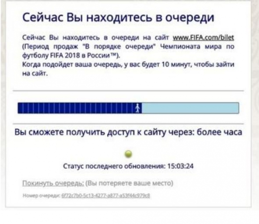 Вчера FIFA начала очередной этап продажи билетов на чемпионат мира по футболу-2018. Из сообщения на сайте ассоциации следует, что билеты начали продаваться «в порядке очереди» в зависимости от их наличия. Однако многие болельщики не сумели воспользоваться своим правом на покупку.