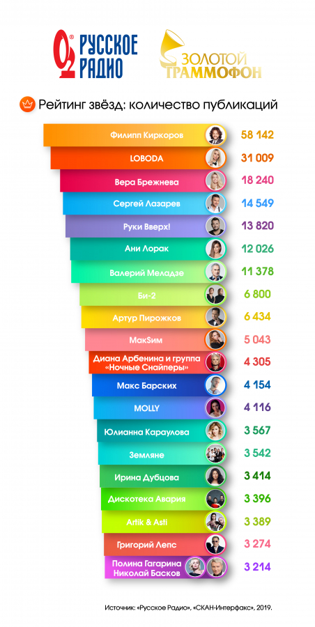 По результатам исследований «СКАН-Интерфакс», «Русское Радио» назвало двадцать наиболее заметных в медиапространстве фигур шоу-бизнеса. Первое место в ТОП-20 занял Филипп Киркоров. Его персона остается наиболее заметной в СМИ: в этом году о нём было 58 142 упоминаний, индекс его заметности — 2,5 млн.