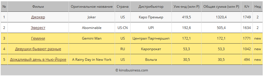 По данным «Бюллетеня кинопрокатчика», за 9 месяцев 2019 года отечественные фильмы собрали 9 млрд руб. Иностранные релизы собрали 31,3 млрд руб., или на четверть больше, чем за 9 месяцев 2018 г. Уже две голливудские картины собрали в этом году 3 млрд руб. — «Король Лев» и «Мстители: финал» от Disney. Касса еще восьми голливудских картин превысила 1 млрд руб. У России же только один миллиардник — военная драма «Т-34» со сборами 2,3 млрд руб.