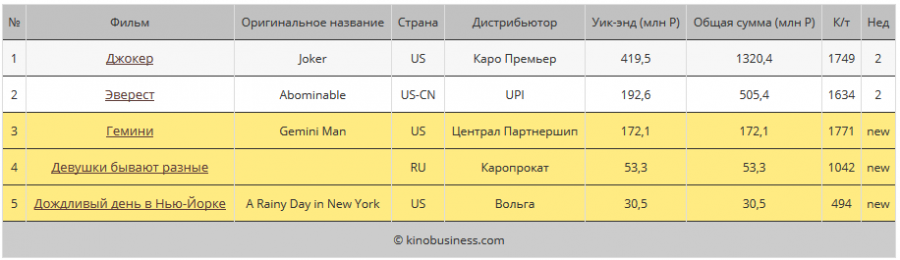 Второе место в российском рейтинге, как и неделей ранее, занимает мультфильм «Эверест» (Abominable) американо-китайского производства от создателей «Корпорации монстров» и «Сезона охоты». За выходные картина собрала 192,6 млн рублей.