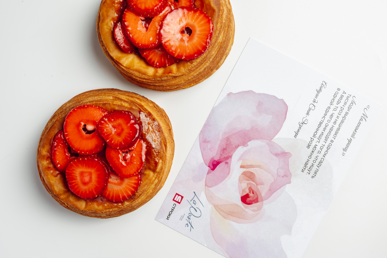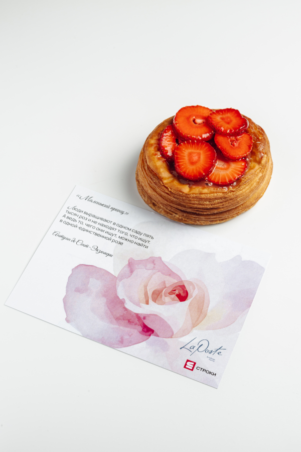 К 125-летию Антуана де Сент-Экзюпери пекарня La Poste и книжный сервис «Строки» представили лимитированный десерт, вдохновленный образом розы из «Маленького принца». С 27 по 29 июня можно попробовать крем-брюле с бурбонской ванилью, ревенево-клубничным компоте и свежей клубникой в форме бутона.