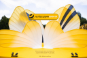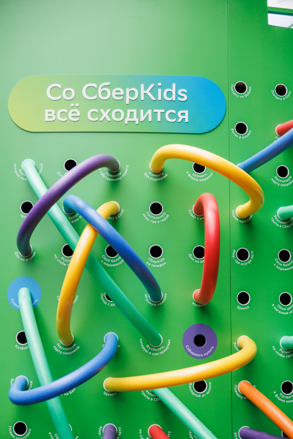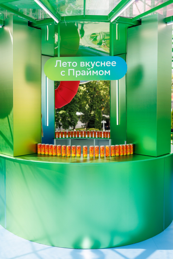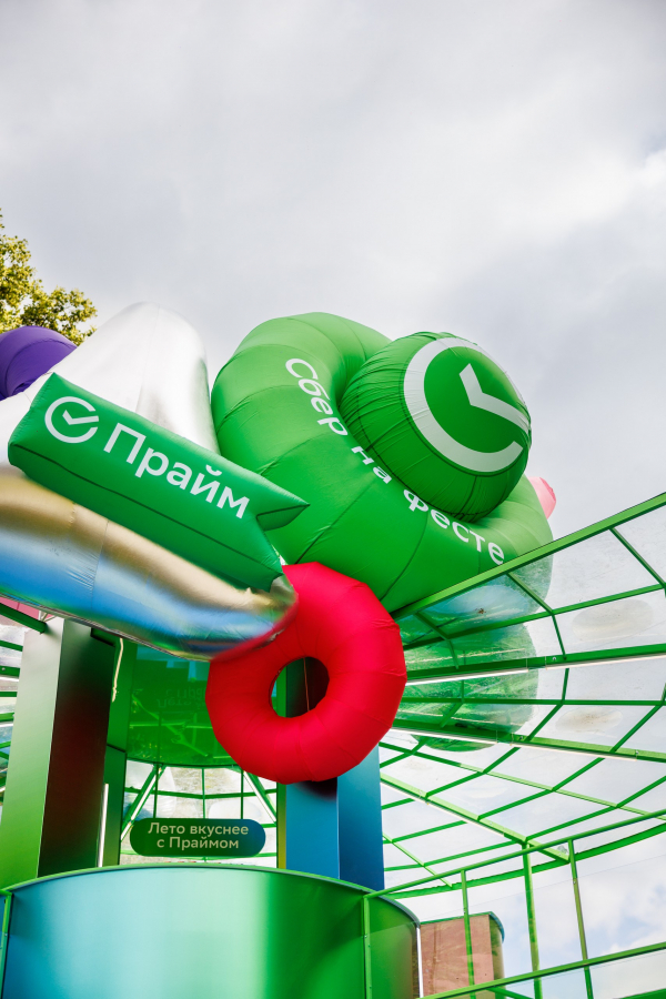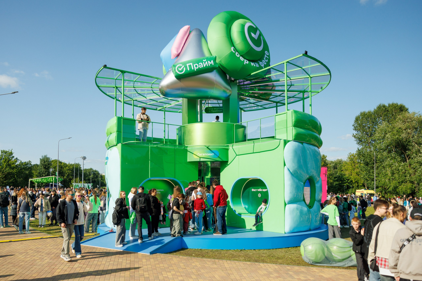 Площадка «Сбера» — это архитектура, в которую может встроиться любой бренд без нарушения общей логики. Она не перегружена смыслом и задает нужный тон: бренд здесь, чтобы помочь сделать лето лучше. В основе дизайна — тренд на надувные формы. Сама бренд-зона — интерактивное пространство с бинго-квестом, фотозоной, лимитированным мерч-шопом, экраном-улыбкой, территорией «СберKids» для детей и другими точками.