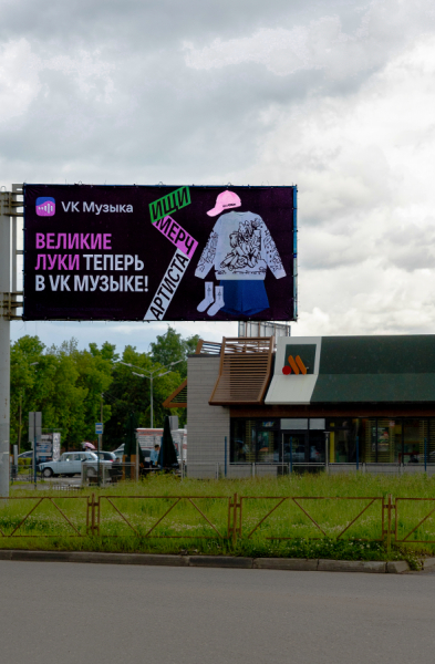В стриминге «VK Музыка» появился новый раздел с мерчем артистов, и сервис анонсировал его необычной наружной рекламой. Он разместил билборд с надписью «Великие Луки теперь в "VK Музыке"», отсылая к появлению в сервисе раздела с товарами от артистов — от футболок до сюрприз-боксов.