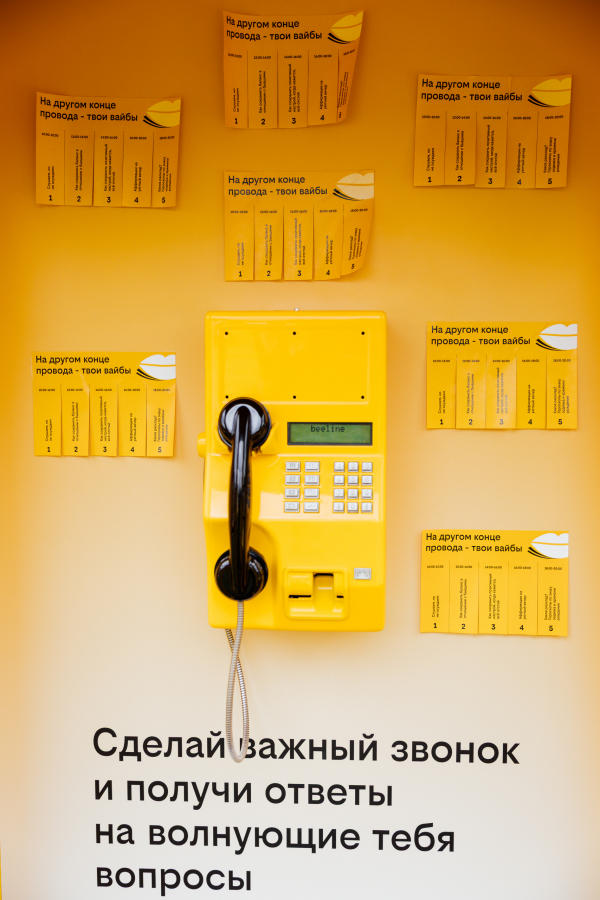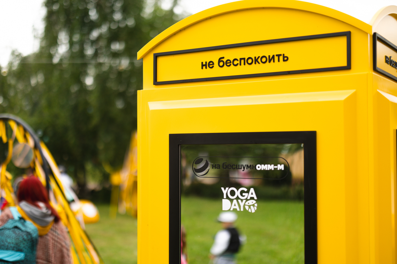 В основе креативной концепции — идея бесшумного режима: в телефоне, во время занятия йогой и по жизни. Внутри — фотозона, стенд с мерчем, глиттер-бар, пространство для креативного мастер-класса, телефонная будка и качели-гамаки. Слоганы на арт-объектах призывают гостей «включить настоящее, слушая себя, а не суетливый город».