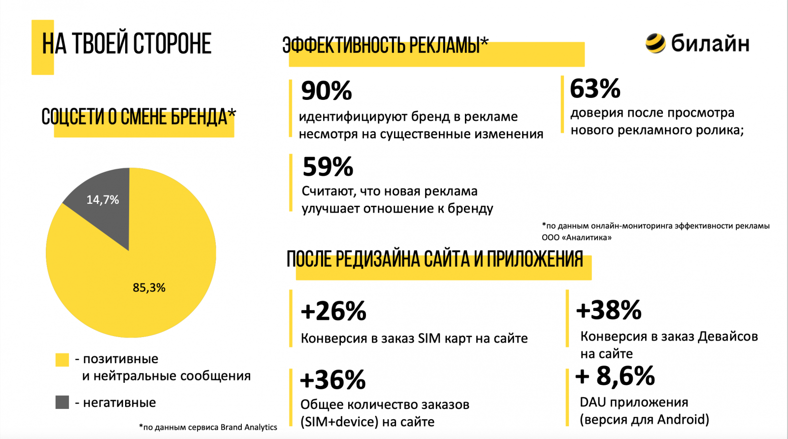 Также «билайн» представил результаты исследования пользовательского отношения к ребрендингу. По данным сервиса Brand Analytics, 85% оценили смену бренда позитивно и нейтрально. Онлайн-мониторинг эффективности рекламы, который провело ООО «Аналитика» показал, что 90% идентифицируют бренд в рекламе несмотря на существенные изменения. 59% считают, что новая реклама улучшает отношение к бренду, а у 63% она вызывает доверие.