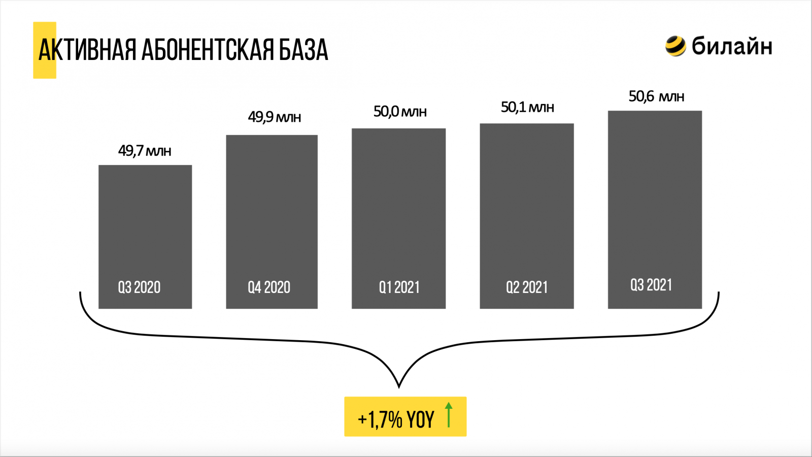 Абонентская база «билайна» за третий квартал расширилась на 500 тыс. до 50,6 млн человек. База пользователей 4G достигла 25,4 млн абонентов, что на 16,9% больше по сравнению с третьим кварталом 2020 года.