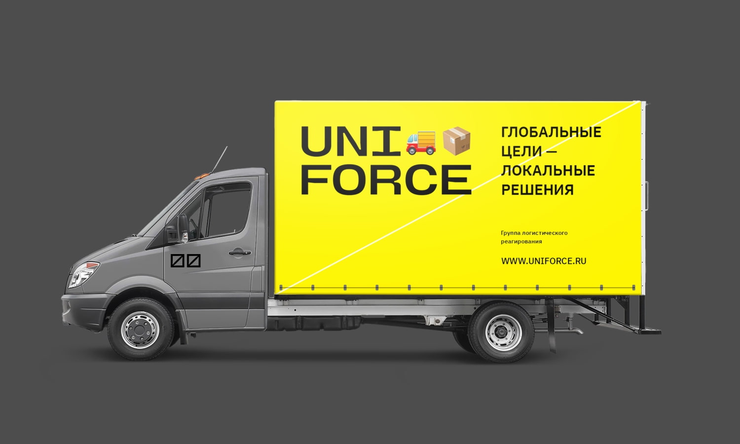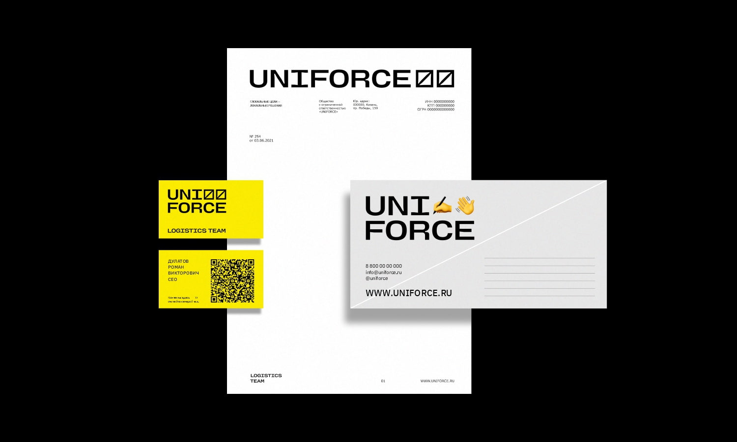 Например, в некоторых компаниях есть корпоративные футбольные команды, которым нужна брендированная форма и спортивный инвентарь. Или организация на каждый праздник делает подарки сотрудникам и постоянным клиентам — тогда в списке носителей могут оказаться подарочные пакеты, календари, кружки, ручки и другие полезные вещи. В пример можно привести брендинг визиток и других бумажных носителей для компании Uniforce, которая занимается логистическим бизнесом. Также была задача создать образ для грузоперевозочных машин этого же бренда.