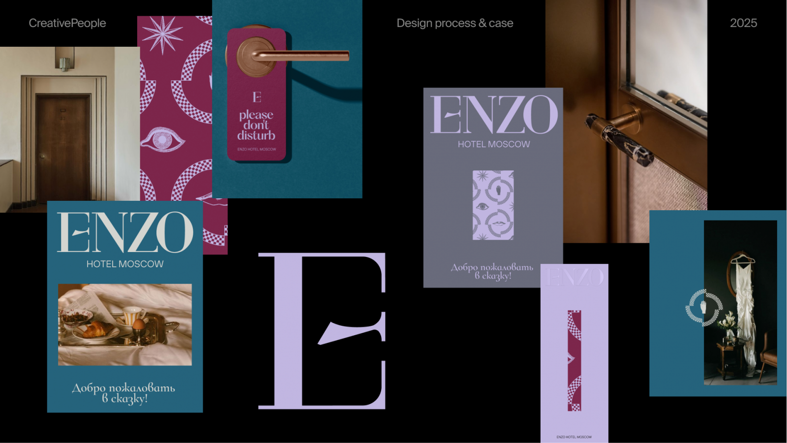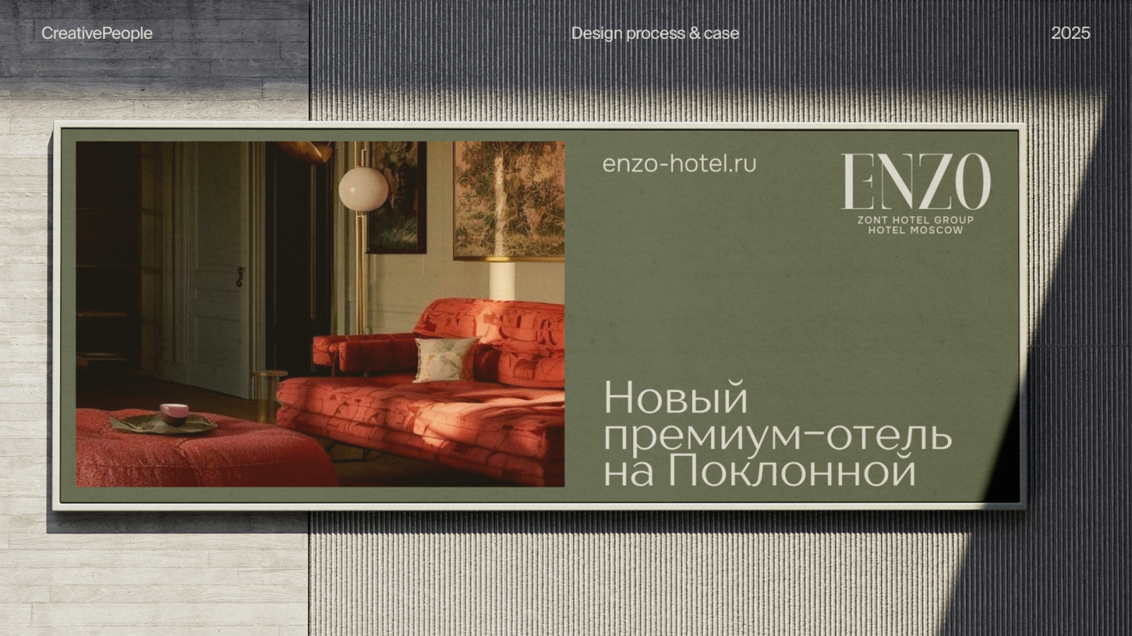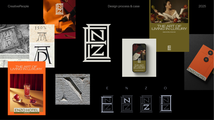 Название отеля придумал клиент: это соединение «en» (сокращенное enjoy) и «zo» — отсылка к ZONT Hotel Group. Также в переводе с итальянского название отеля enzo означает «правитель», «домохранитель». На основе архетипа и названия мы предложили легенду бренда: ENZO — это итальянский архитектор, гостеприимный создатель отеля.