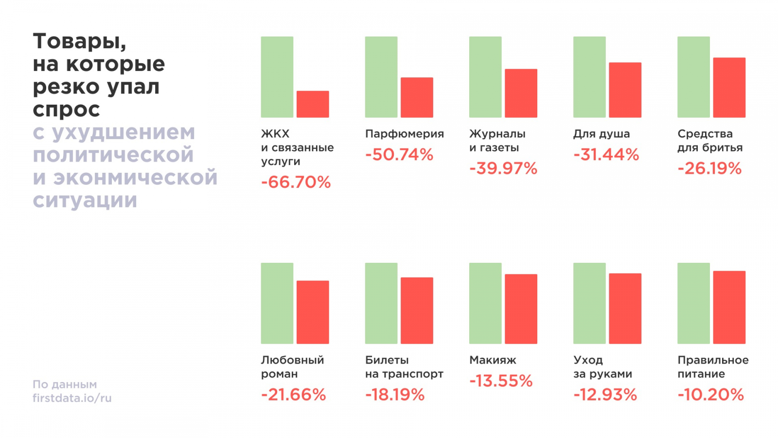 Больше остальных расходы сократились в категории «ЖКХ и связанных услуг» — на 66%. Для многих коммунальные платежи составляют весомую долю расходов, а отсутствие моментальных штрафов за просрочку позволяет не оплачивать счета по несколько месяцев. Далее следуют парфюмерия и косметика: расходы на различные товары в этой категории снизились до 50%, и это несмотря на традиционно высокий спрос в преддверие 8 марта. Кроме того, россияне решили повременить с чтением любовных романов — продажи книг этого жанра упали на 21%. Возникшая ситуация, очевидно, вынудила многих отказаться от поездок — расходы на железнодорожные и авиабилеты упали на 18%.