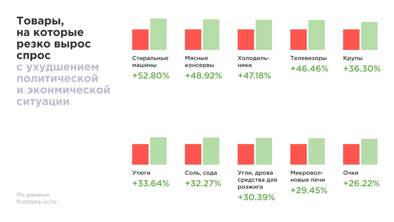 С электроникой смогли конкурировать только мясные консервы — на них россияне потратили на 48% больше, чем обычно. Помимо этого, соотечественники закупились солью, крупами, содой — расходы на эти товары выросли более, чем на треть, и топливом — дров и угля закупили на 30% больше, чем обычно. Пользовались повышенным спросом очки и линзы — аналитики First Data фиксируют рост покупок на 26%. Скорее всего он связан с возможным запретом на ввоз продукции или отказом ряда брендов работать на территории России, считают в компании.
