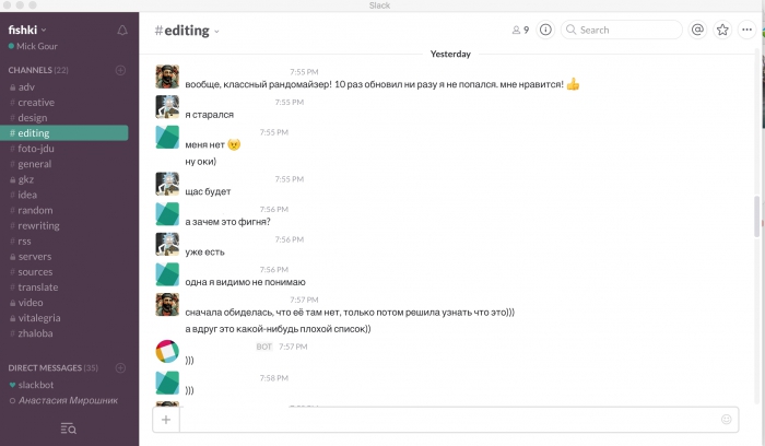 Работа редакции "Фишек" в Slack