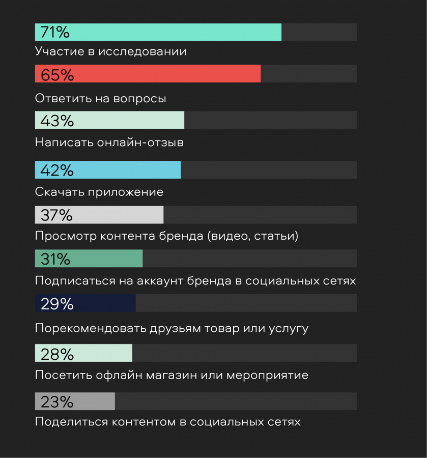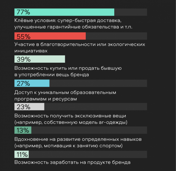 Согласно исследованиям и нашему опросу, участникам программ лояльности важна не просто материальная мотивация, но и возможность вступить в более сложную коммуникацию с брендом — большинство привлекают вовлекающие механики, возможности для саморазвития и личного вклада во что-то большее.