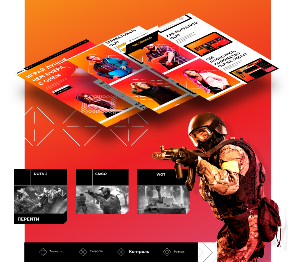 Проект Omen2Play тоже учитывал специфику аудитории и строил UX по привычным для геймеров схемам. У бренда игровой техники HP стояла цель построить долгосрочные отношения с геймерами — как владельцами устройств OMEN, так и потенциальными покупателями. Мы создали онлайн-платформу с системой лояльности, где пользователи могли бесплатно пользоваться платформой, развивать навыки в играх Dota2 и CS:GO, зарабатывать игровую валюту, а также получать специальные офферы для покупки девайсов OMEN by HP.