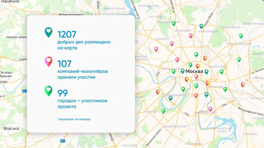 За полгода существования веб-платформы 107 компаний-волонтеров из 99 городов разместили на карте более 1200 добрых дел. Самым популярным видом волонтерства стала «Экология», а самыми добрыми городами — Мурманск, Москва и Новотроицк.