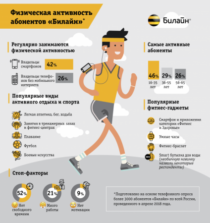 При разработке акции «Гиги за шаги» в апреле 2018 года «Билайн» проанализировал, насколько физически активны его абоненты. В телефонном опросе, проведенном в апреле 2018 года, приняло участие более 3000 пользователей, мужчины и женщины в возрасте от 16 до 65 лет. В рамках исследования 42% владельцев смартфонов отметили, что регулярно занимаются физической активностью. Более 71% следят за показателями своих тренировок с помощью смартфонов, а 43% ставят план по количеству пройденных шагов в сутки.
