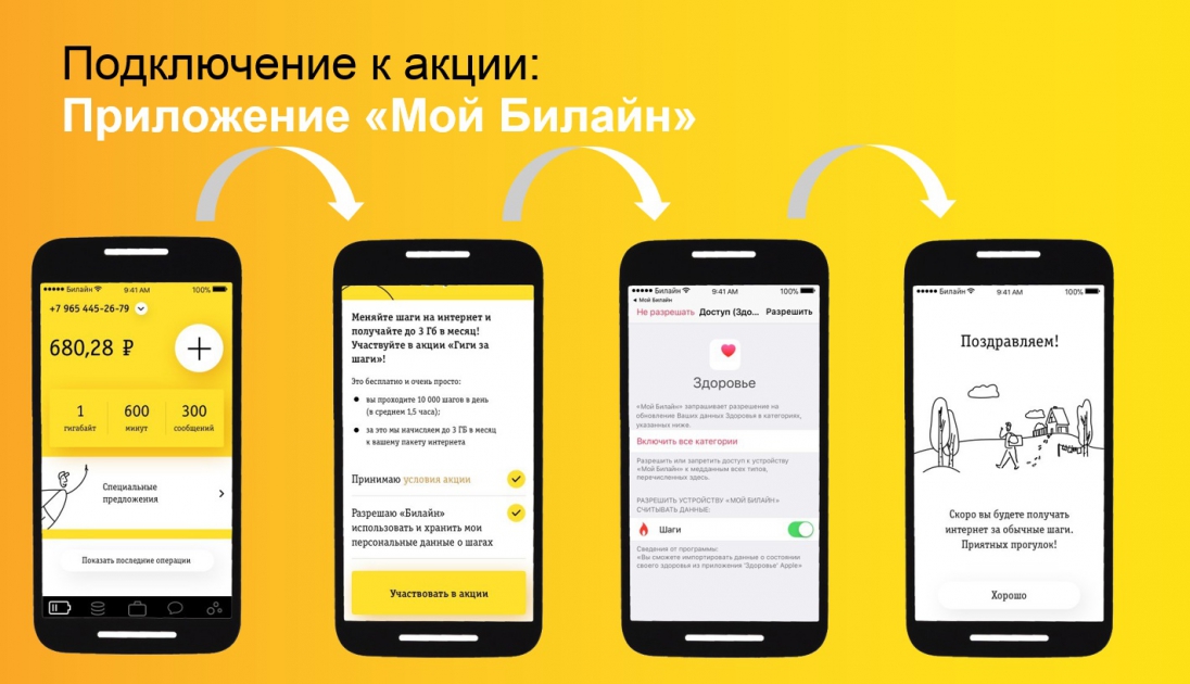 С каждым годом в фитнес-залах, на спортивных площадках в парках и во дворах становится все больше людей. Ориентируясь на эти увлечения, в новом предложении мы совместили два ключевых тренда: возможность управлять своими услугами и стремление вести здоровый образ жизни. Для тех, кто уже ведет активный образ жизни, участие в акции — это прекрасная возможность получать реальную выгоду за привычные действия, а для тех, кто менее спортивен — приятный дополнительный стимул начать действовать. Уверены, что нашим клиентам понравится как просто можно превратить пройденные шаги в интернет-трафик, а полученные результаты и польза для здоровья сделают их счастливыми.