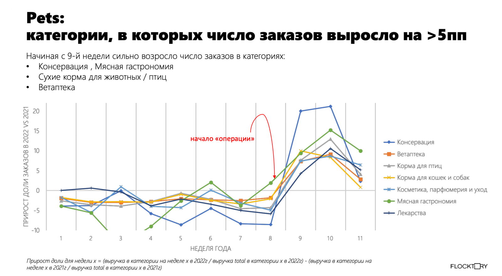 Согласно данным исследования, с восьмой календарной недели, которая пришлась на начало спецоперации, наблюдалось увеличение доли покупательского кошелька в категориях «Товары для животных» и «Товары для дома и ремонта». При этом аналитики фиксировали сокращение доли расходов на категории «Ювелирные изделия», «Книги» и «Развлечения».