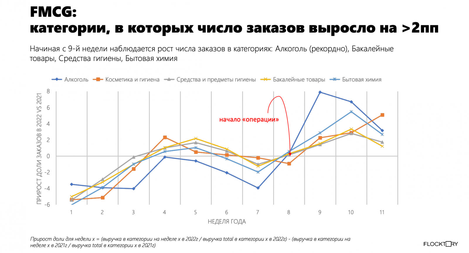В отчёте приводится изменение онлайн-потребления в периоды «до спецоперации» (с 3 февраля по 23 февраля) и «во время» (с 24 февраля по 16 марта). Аналитики Flocktory сравнили результаты с данными за аналогичные периоды прошлого года.