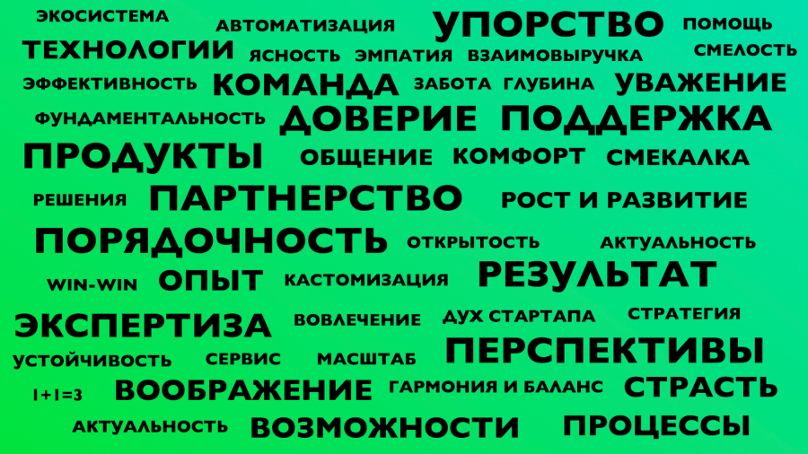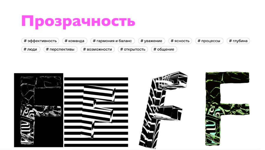 Прозрачность. Наш бизнес прозрачен во всём: отчётность, работа с данными (строго в соответствии со 152 ФЗ), процессы, результаты, стоимости, взаимоотношения внутри отделов и компании и так далее, потому что без честности и доверия не может быть прочных отношений.