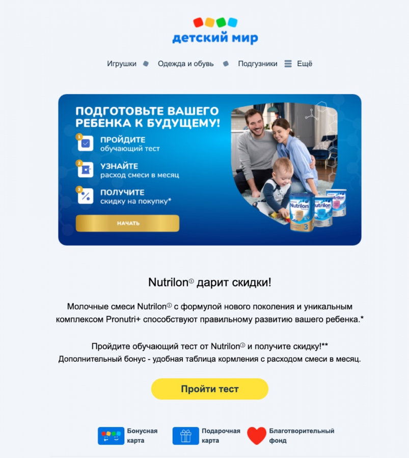 На сформированный аудиторный сегмент была произведена рассылка писем от имени «Детского мира» с мотивационным промопредложением от Nutricia.