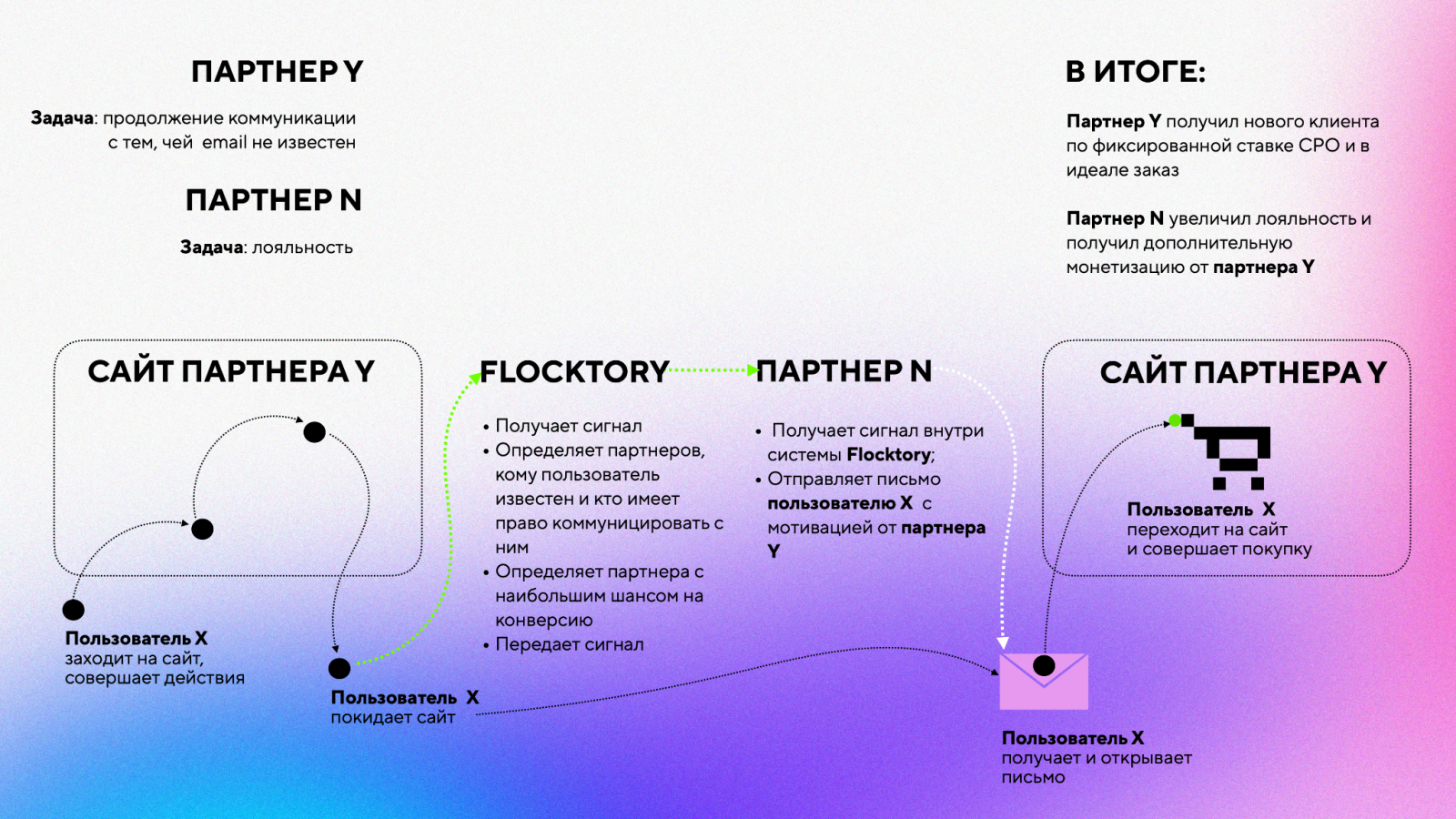 Этот пользователь, скорее всего, будет известен ряду партнёров Flocktory (неконкурентов партнёру Y назовём партнёры N), которые смогут отправить ему email от своего имени с коммуникацией от партнёра Y.