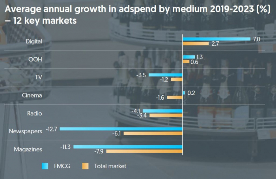В целом траты FMCG-брендов на рекламу будут расти на 4% в год. На 1,3% будут увеличиваться расходы на наружную рекламу, на 0,2% - на рекламу в кинотеатрах. Радио, газеты, журналы и телевидение потеряют часть бюджетов.
