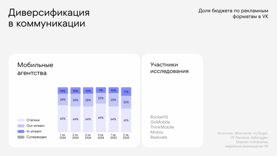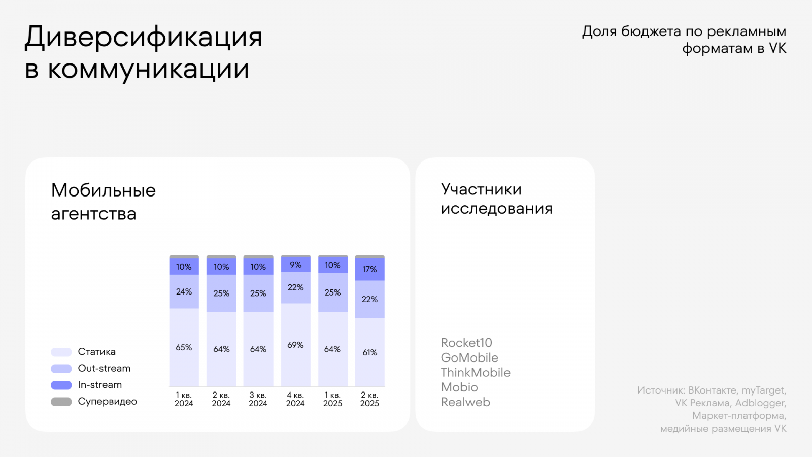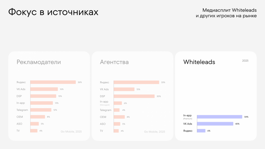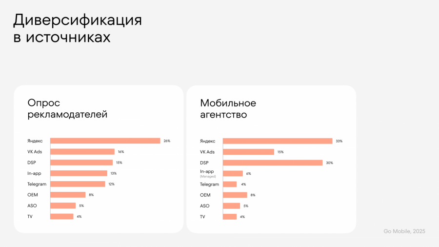 Свежие рыночные опросы показывают, что медиасплит рекламодателей и мобильных агентств включает минимум восемь типов источников: «Яндекс», VK, Telegram, DSP, OEM, ASO, CTV и даже Managed In-app, от которого многие не готовы отказаться, несмотря на очевидные риски фрода.