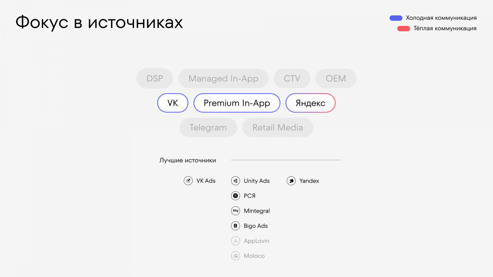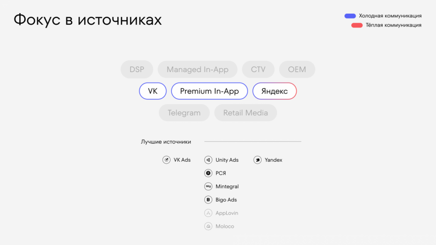 Опыт показывает, что такого ограниченного пула из нескольких проверенных площадок достаточно, чтобы закрывать все задачи в User Acquisition. Этот компактный сплит позволяет эффективно расходовать бюджет, избегать фрода и привлекать миллионы реальных, лояльных пользователей без распыления ресурсов.