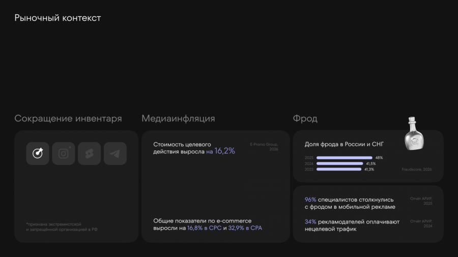 Попытки рынка найти более дешевый трафик привели к высокому уровню фрода, доля которого в России и СНГ достигла 48% от всей мобильной закупки в России. По мнению экспертов, почти каждый второй рубль из рекламного бюджета уходит на оплату действий ботов, а не реальных пользователей.