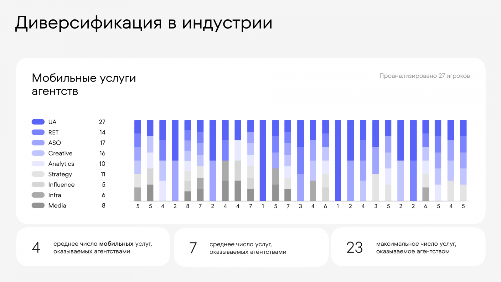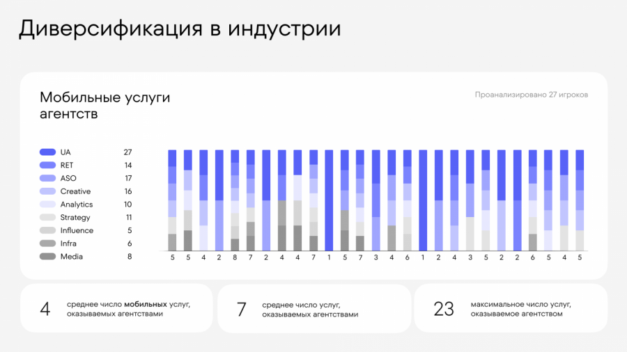 Команда агентства проанализировала 27 игроков на рынке мобильного маркетинга. В среднем одно агентство оказывает 4 мобильные услуги и 7 услуг в целом, максимум доходит до 23. Цифры наглядно подтверждают: рынок в основном делает ставку именно на диверсификацию.