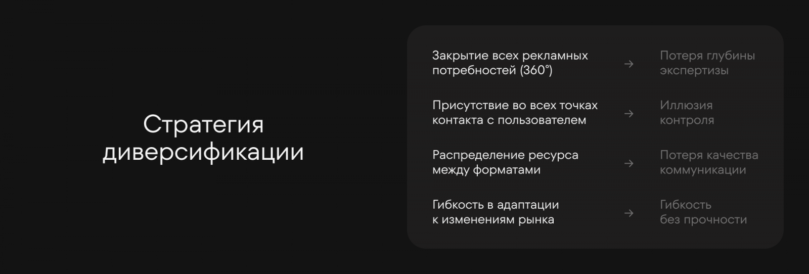 В своей основе стратегия диверсификации — это распределение ресурсов по максимально широкому спектру услуг, пулу источников и форматов коммуникации. Компании предполагают, что такой подход позволит гибко адаптироваться к постоянным изменениям рынка.