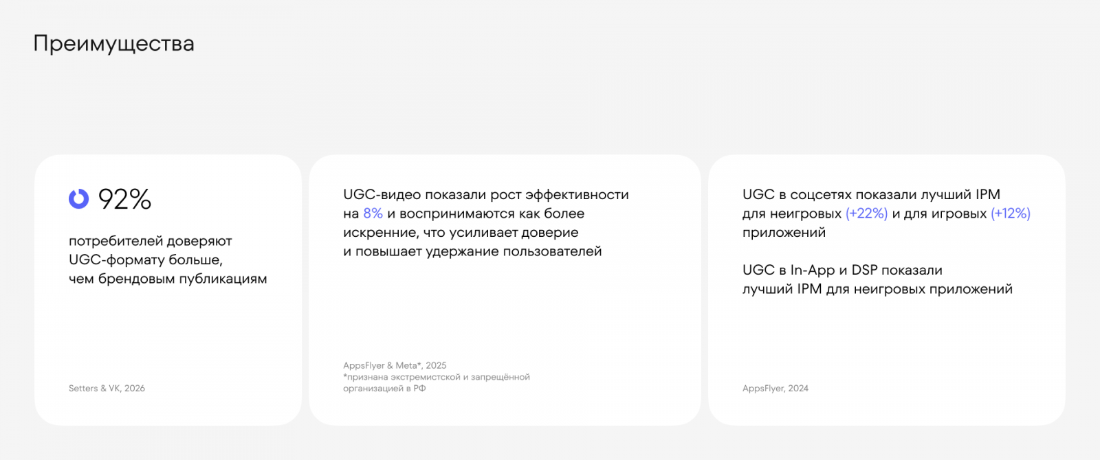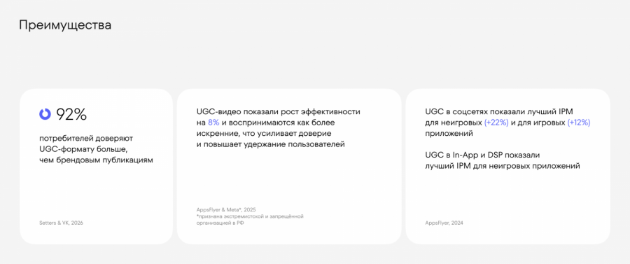 Рыночные данные это подтверждают: 92% российских потребителей доверяют UGC-формату больше, чем классическим брендовым публикациям. Креативные отчеты AppsFlyer из года в год отмечают, что UGC остаётся наиболее эффективным форматом для продвижения неигровых приложений абсолютно на всех площадках — как в социальных сетях, так и в In-App сетях.