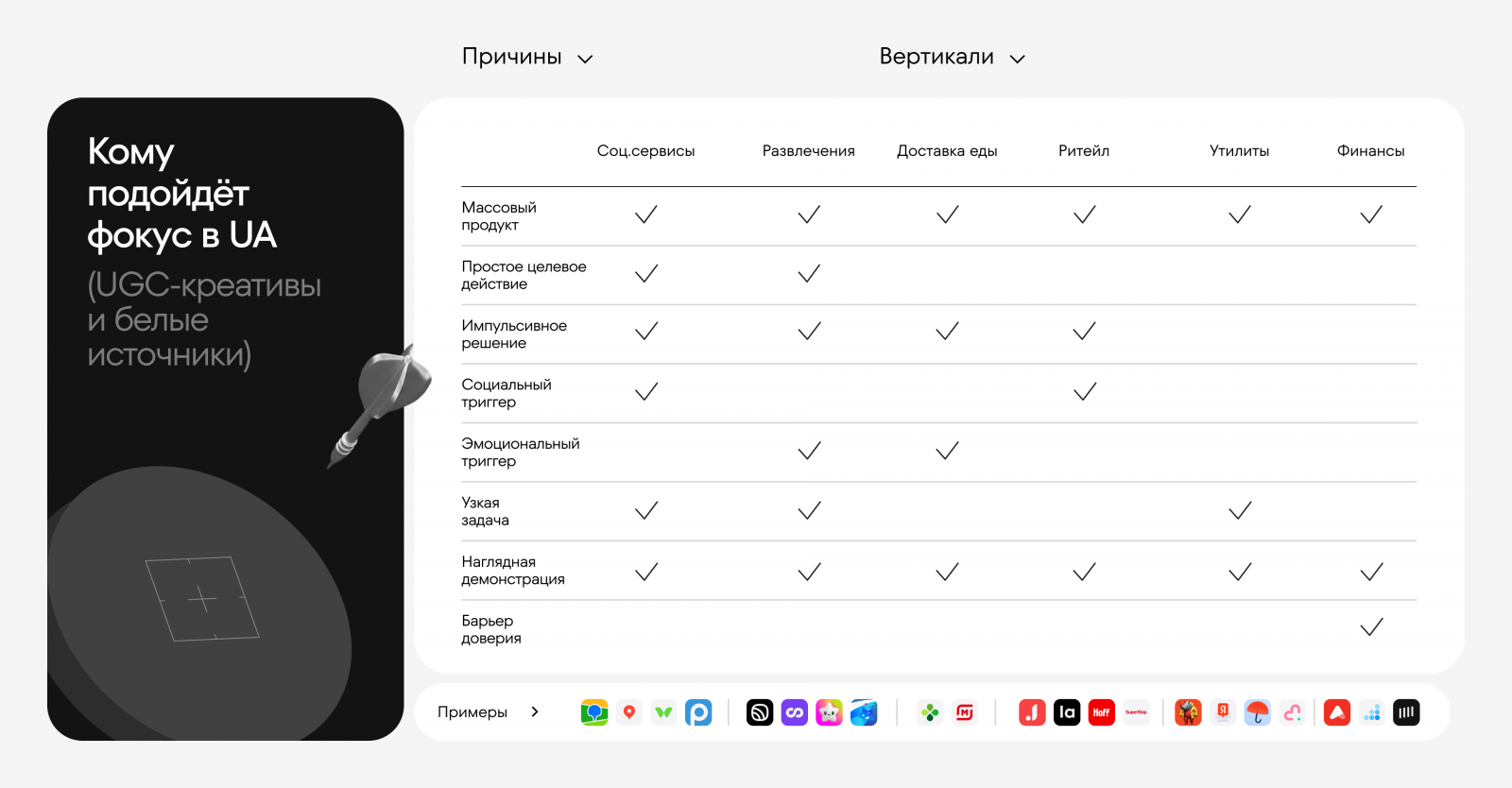 На уровне креативов стратегия фокуса означает осознанный отказ от распределения бюджетов в слабые форматы. Нет смысла тратить ресурсы на медийный шум в виде статичных баннеров или рекламы иконкой приложения, когда есть UGC-видео. На сегодняшний день это самый актуальный и эффективный формат коммуникации в России и мире.