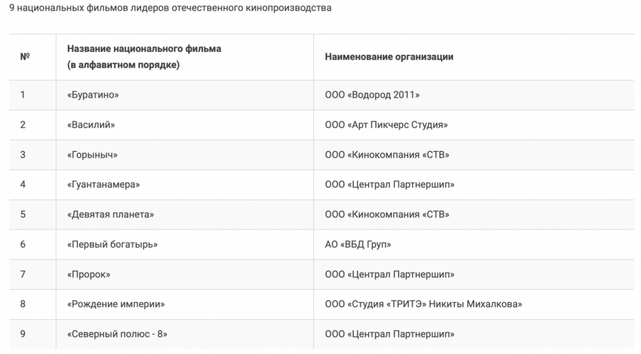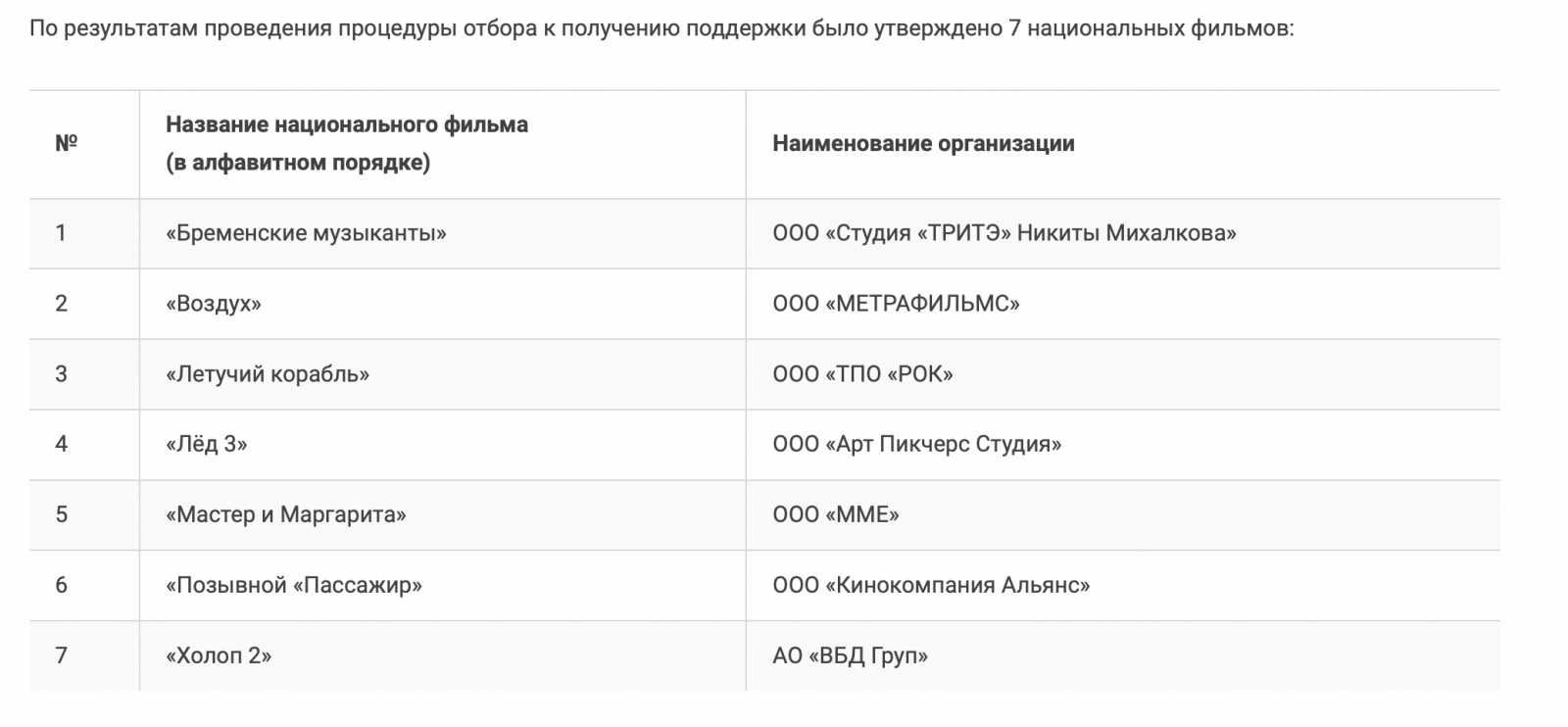 Поддержку получат семь национальных фильмов: «Бременские музыканты» («Тритэ»), «Воздух» («Метрафильмс»), «Летучий корабль» («ТПО «Рок»), «Лёд 3» («Арт Пикчерс Студия»), «Мастер и маргарита» («ММЕ»), «Позывной "пассажир"» («Кинокомпания альянс»), «Холоп 2» («ВБД Груп»).